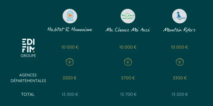 Chaque année, EDIFIM s’engage à verser 10 000€ à chacune des trois associations partenaires. À cette contribution s’ajoute un don de 100€ pour chaque logement neuf acquis, reversé à l’association choisie par nos clients.