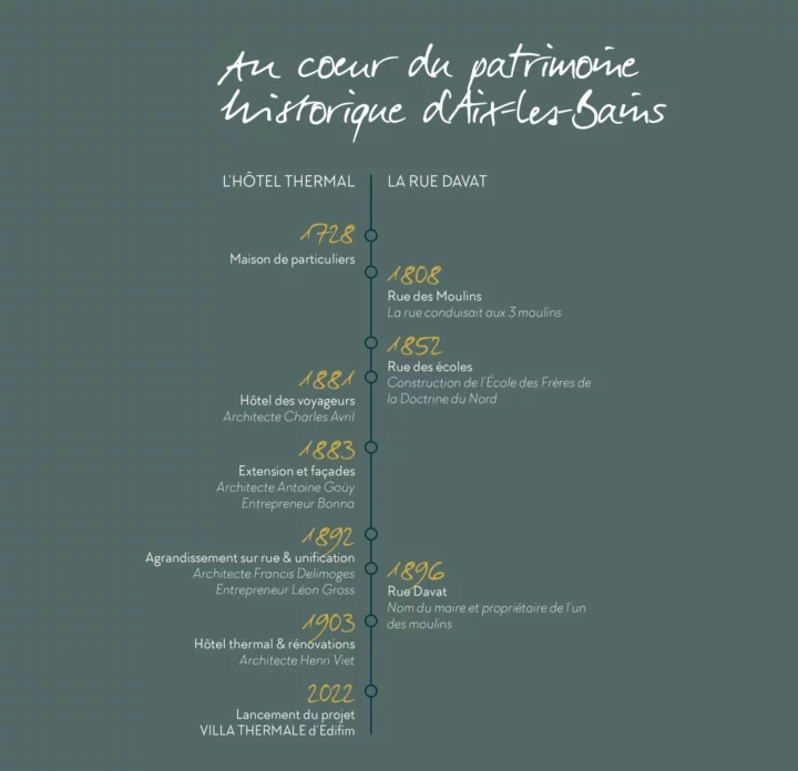 Mais en cette année 2022, EDIFIM entreprend de rendre sa superbe à cet ancien hôtel, aux façades classées au patrimoine historique. Des appartements d’exception ainsi que des locaux d’activités seront créés dans ces anciens murs, pour que l’Hôtel Thermal redevienne un lieu de vie pour les épicuriens et les amoureux d’Histoire et d’architecture : VILLA THERMALE.