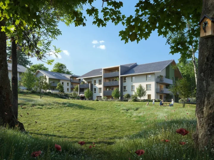 Organisée autour d’un vaste parc central, la résidence s’intègre dans un environnement naturel préservé mêlant prairies fleuries, arbres et cheminements doux. Cette conception renforce la qualité de vie au quotidien, en créant une continuité entre habitat et nature.