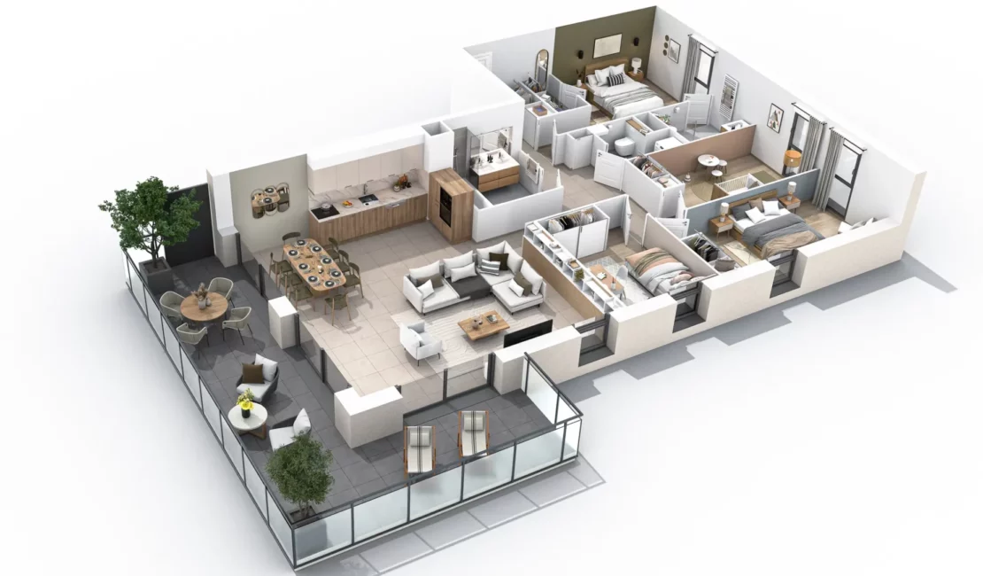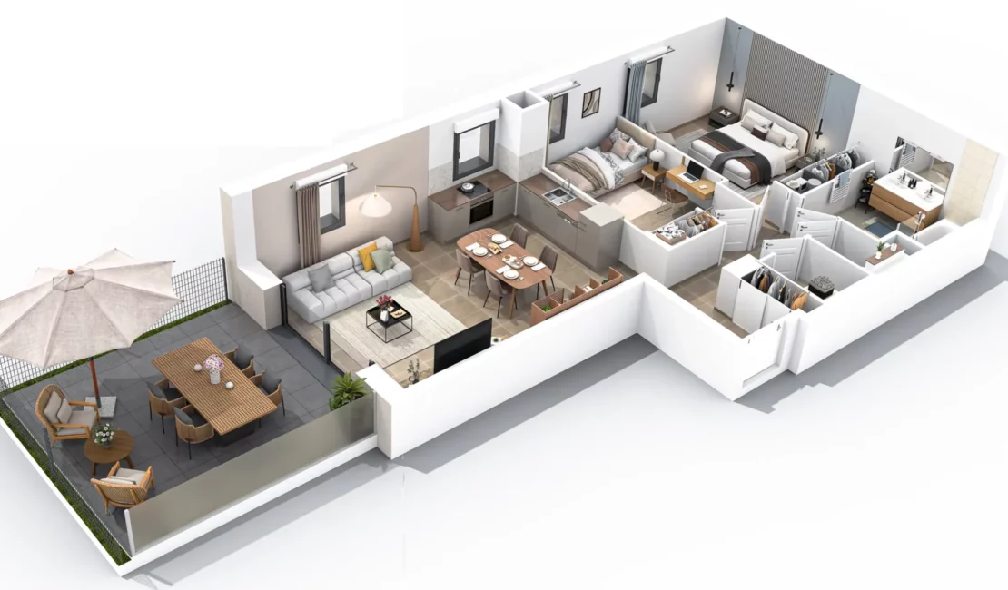 L’architecture mêle sobriété contemporaine et inspirations locales, avec des toitures à deux pans, des jacobines et des portiques en bois naturel qui confèrent à l’ensemble chaleur et authenticité. L’intégration des espaces verts et l’aménagement paysager soigné contribuent à créer une atmosphère de sérénité. En partie centrale, une aire de détente d’environ 300 m², entourée d’arbres et d’espaces de stationnement végétalisés, invite à la convivialité.
