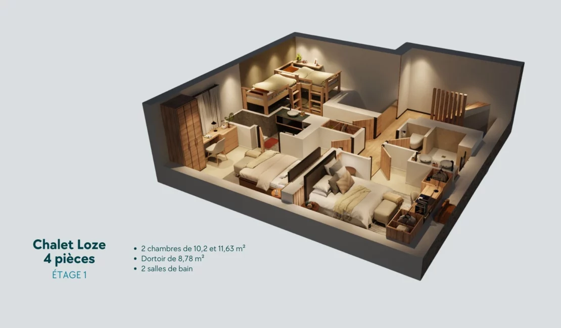 Le séjour avec cuisine ouverte constitue un véritable lieu de convivialité, où le charme du bois se marie à la modernité des aménagements. Les trois chambres, dont une suite parentale, et le dortoir permettent d’accueillir famille et invités dans les meilleures conditions.