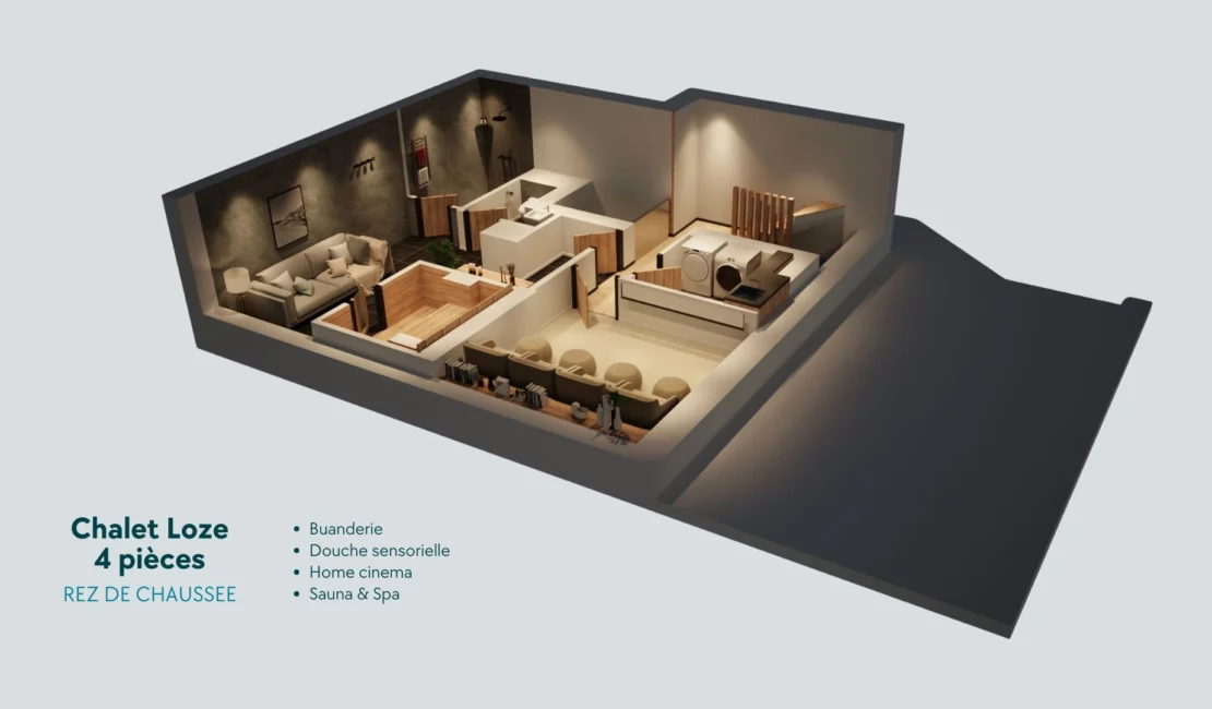 Le chalet dispose également d’un espace détente complet, comprenant un SPA, un sauna, un home cinéma et un ski room parfaitement équipé. Un garage double complète cet ensemble d’exception.