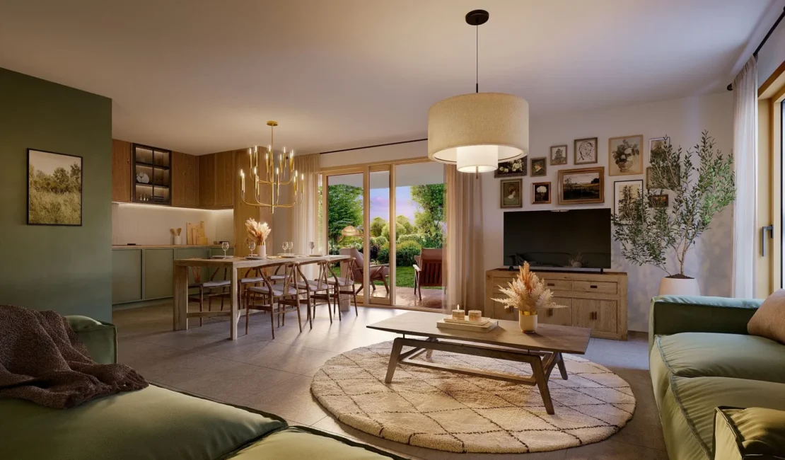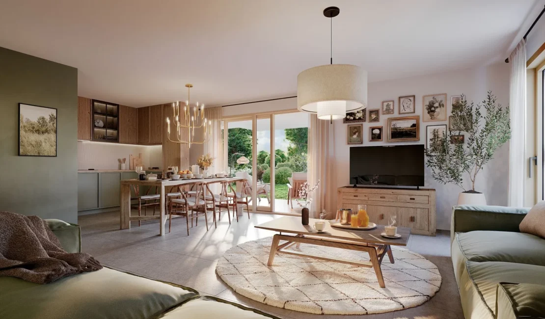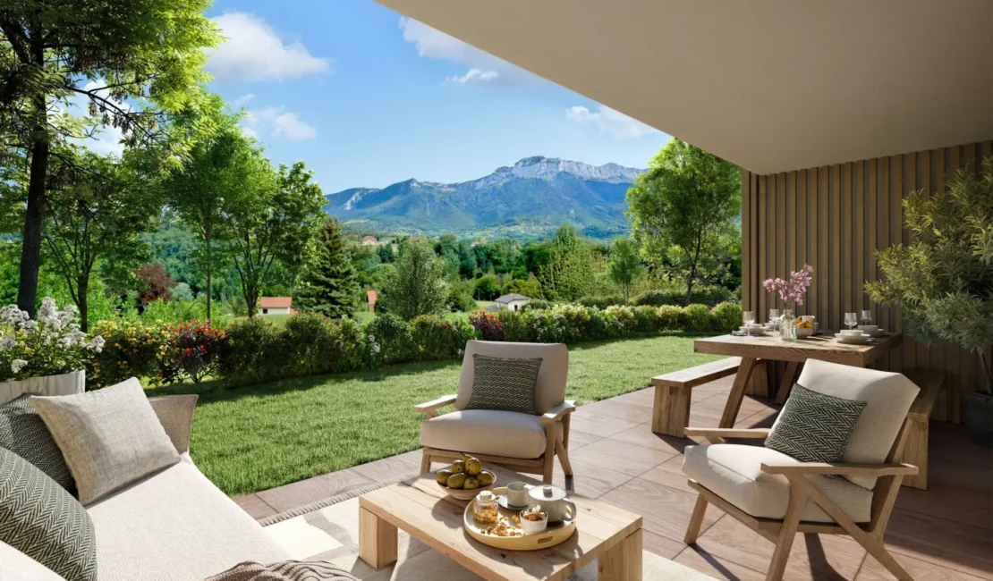Chaque appartement dispose d’un balcon, d’une terrasse ou d’un jardin privatif, permettant de profiter pleinement d’un cadre paysager exceptionnel. Organisée autour d’un vaste parc central, la résidence s’inscrit dans un environnement naturel préservé mêlant prairies fleuries, arbres et cheminements doux, offrant une véritable continuité entre les espaces de vie et la nature environnante.