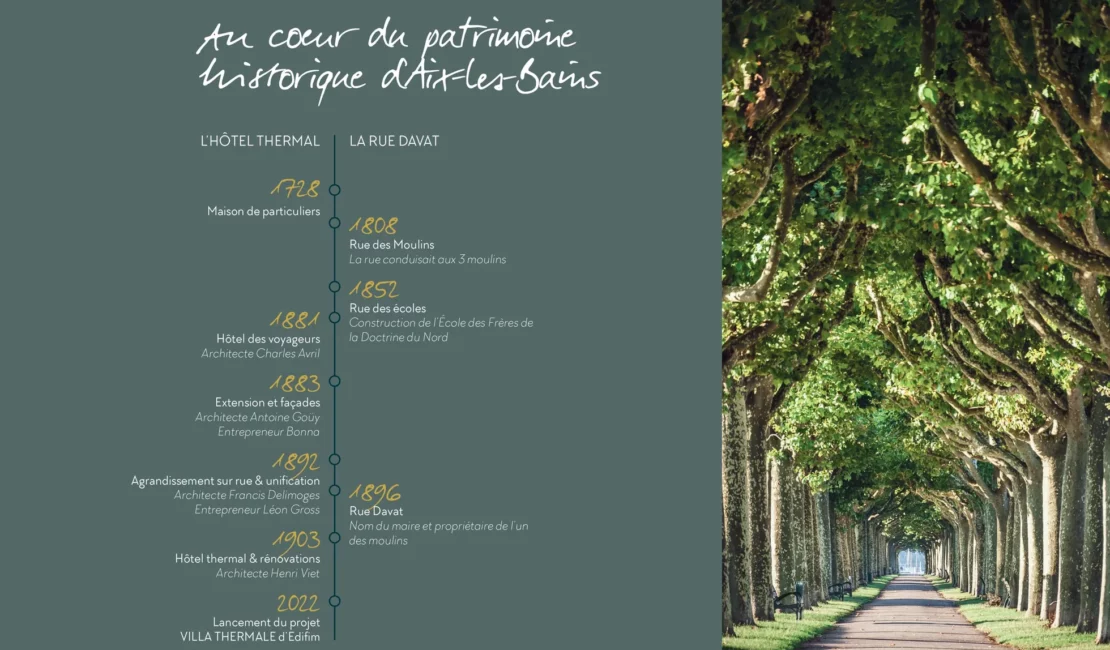 Dans le centre historique d’Aix les Bains, le projet VILLA THERMALE s’installe au cœur de l’« Hôtel Thermal ». La présence du patrimoine environnant est un véritable vecteur de sens du projet. Il nous est apparu essentiel d’identifier les éléments fondamentaux de cet Hôtel pour définir la genèse du projet.